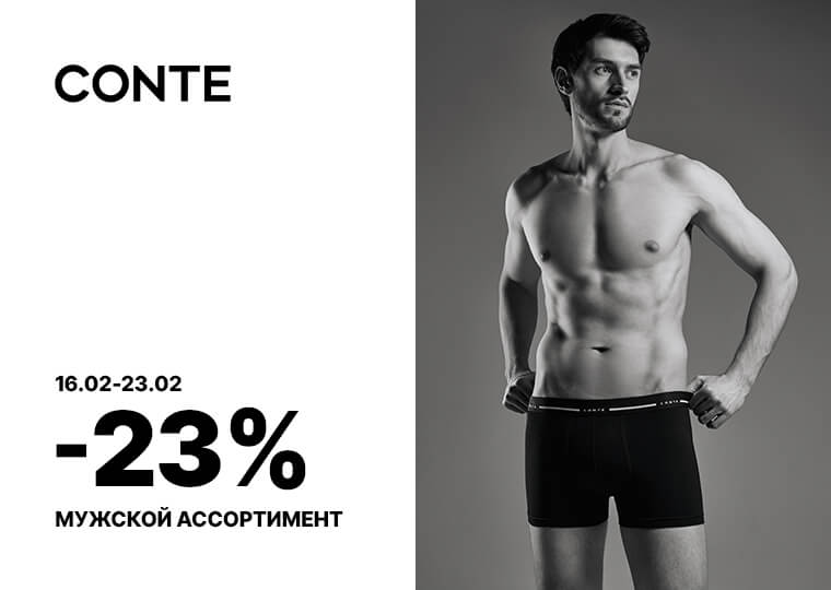 Выбирайте хорошие подарки в СONTE: в магазине бренда действует скидка -23% на мужские джинсы, футболки, белье, носки и подследники.